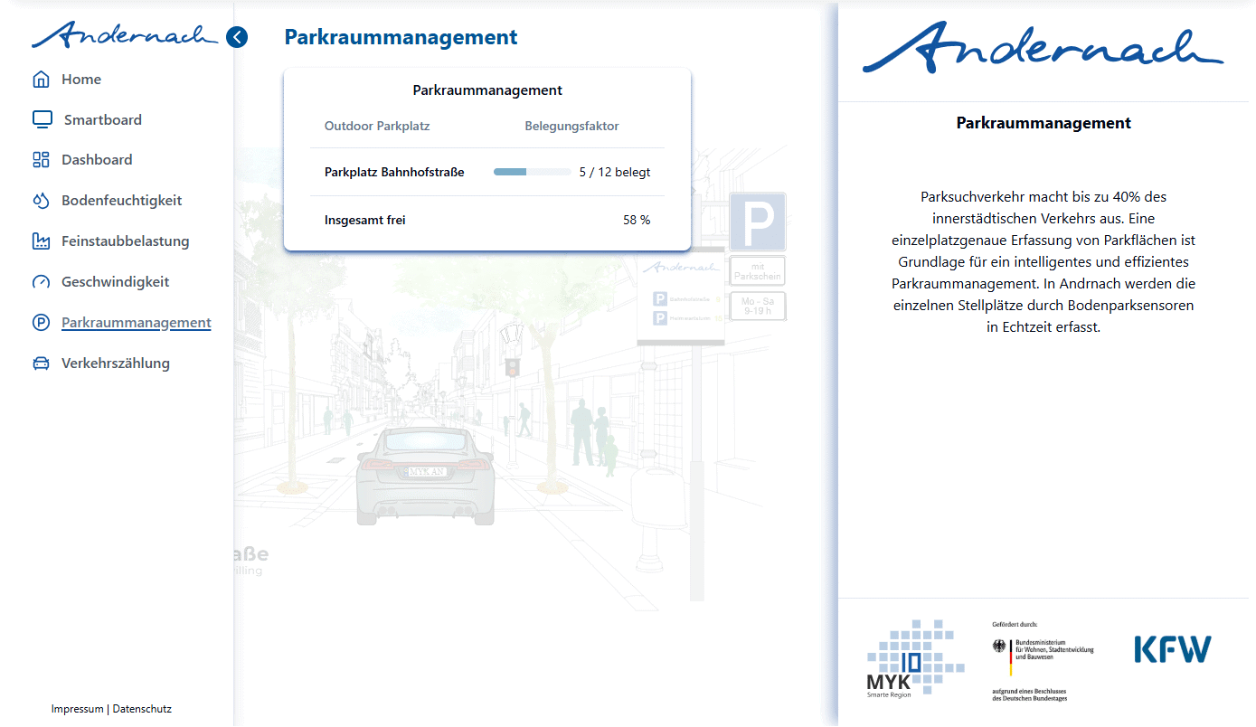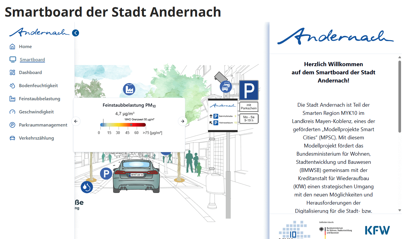 Wie lässt sich eine Innenstadt zukunftsfähig, lebenswerter und digital intelligenter gestalten? Die Stadt Andernach liefert mit dem Pilotprojekt „Smarte Bahnhofstraße“ eine eindrucksvolle Antwort. Mithilfe moderner Sensorik und datenbasierter Analysen werden anonymisierte Informationen zu Verkehr, Parkraumnutzung, Luftqualität und Grünflächen erfasst.