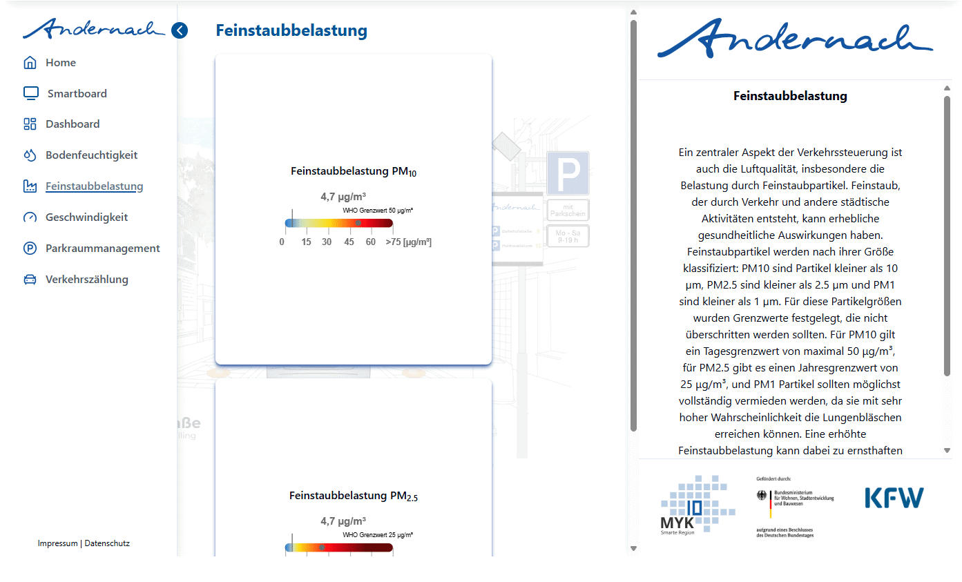 KI-P unterstützt das Projekt mit der Integration und Verarbeitung der Sensordaten sowie der Entwicklung eines nutzerfreundlichen Dashboards für Verwaltung und Bürger. Ziel ist es, die Aufenthaltsqualität zu steigern, Ressourcen effizienter einzusetzen und fundierte Entscheidungen für die Stadtentwicklung zu ermöglichen.